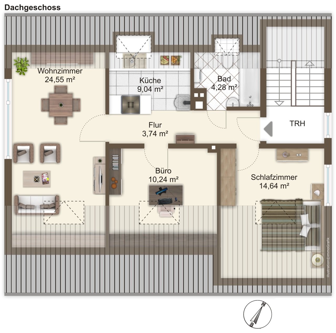 Beim Betreten der Wohnung gelangt man in den Flurbereich, der sämtliche Räume miteinander verbindet. Durch die Südausrichtung des Wohnbereichs (24,55 m²) fällt viel Tageslicht in die Wohnung. Als sehr praktisch erweisen sich diverse Einbauschränke, die in den Schlafzimmern (14,64 und 10,24 m²) sowie auch im Wohnbereich vorhanden sind.
