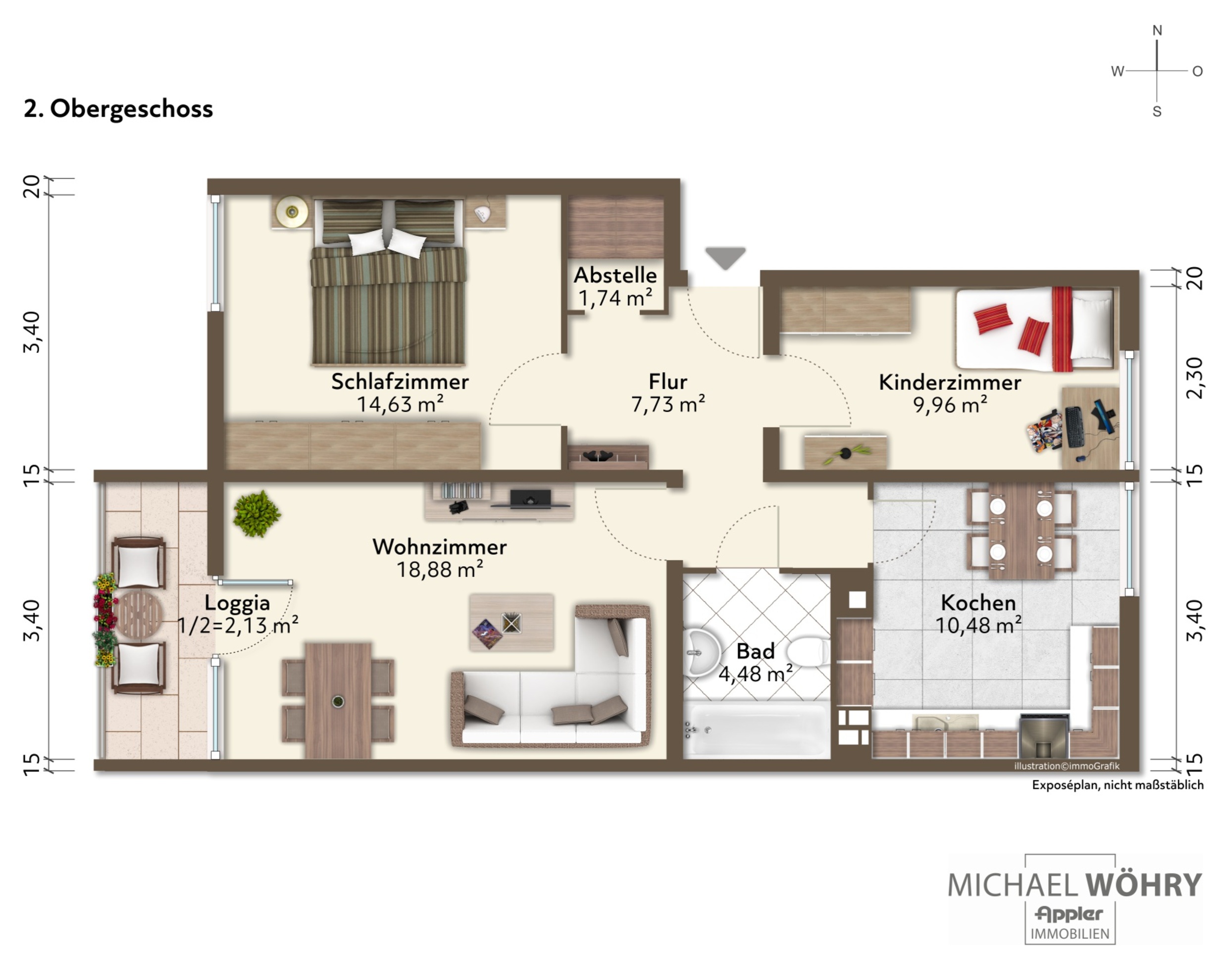 Das Herzstück der Wohnung ist das großzügige, knapp 19 m² große Wohnzimmer mit Zugang zur sonnigen Westloggia. Der separate Küchenbereich bietet ausreichend Platz für eine gemütliche Essecke und lässt sich individuell gestalten.
