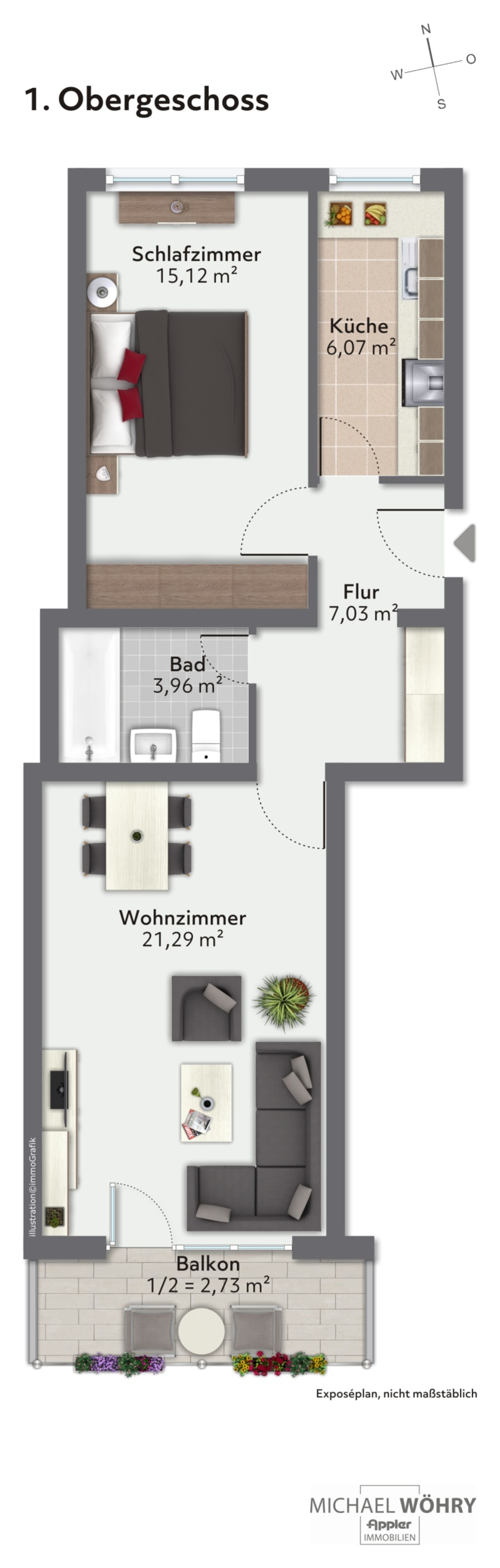 Das Herzstück der Wohnung ist der helle Wohnbereich mit Blick ins Grüne. Von hier aus gelangen Sie direkt auf die großzügige Süd-Loggia, die zum Entspannen und Verweilen einlädt. Das Schlafzimmer bietet genügend Platz für eine komfortable Einrichtung und schafft einen gemütlichen Rückzugsbereich. Ein funktionaler Flur mit praktischen Einbauschränken sorgt für zusätzlichen Stauraum. Der Küchenbereich ist gefliest und mit einer Einbauküche inklusive Elektrogeräten ausgestattet. Das Badezimmer verfügt über eine bodengleiche Dusche, WC und Waschbecken.