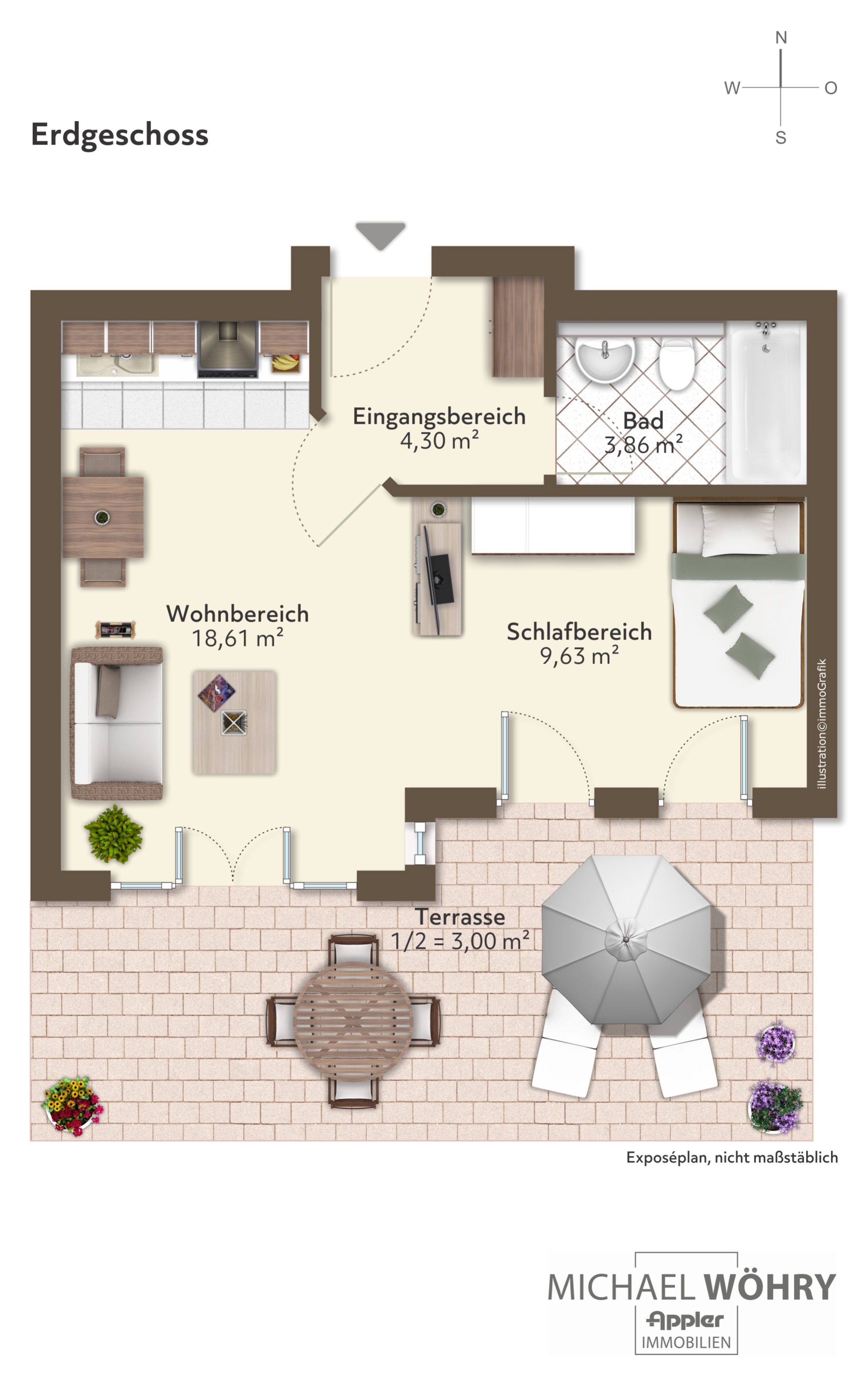Besonders hervorzuheben ist der eigene nach Süden ausgerichtete Garten- und Terrassenbereich. Die Wohnung verfügt über einen großzügigen Wohn-, Schlaf- und Kochbereich von über 28 m², ein gefliestes Badezimmer sowie einen praktischen Dielenbereich. Im Wohn-, Schlaf- und Kochbereich ist ein hochwertiger Parkettboden verlegt worden. Das Badezimmer ist mit einer Badewanne, einem Waschbecken und einem WC ausgestattet.