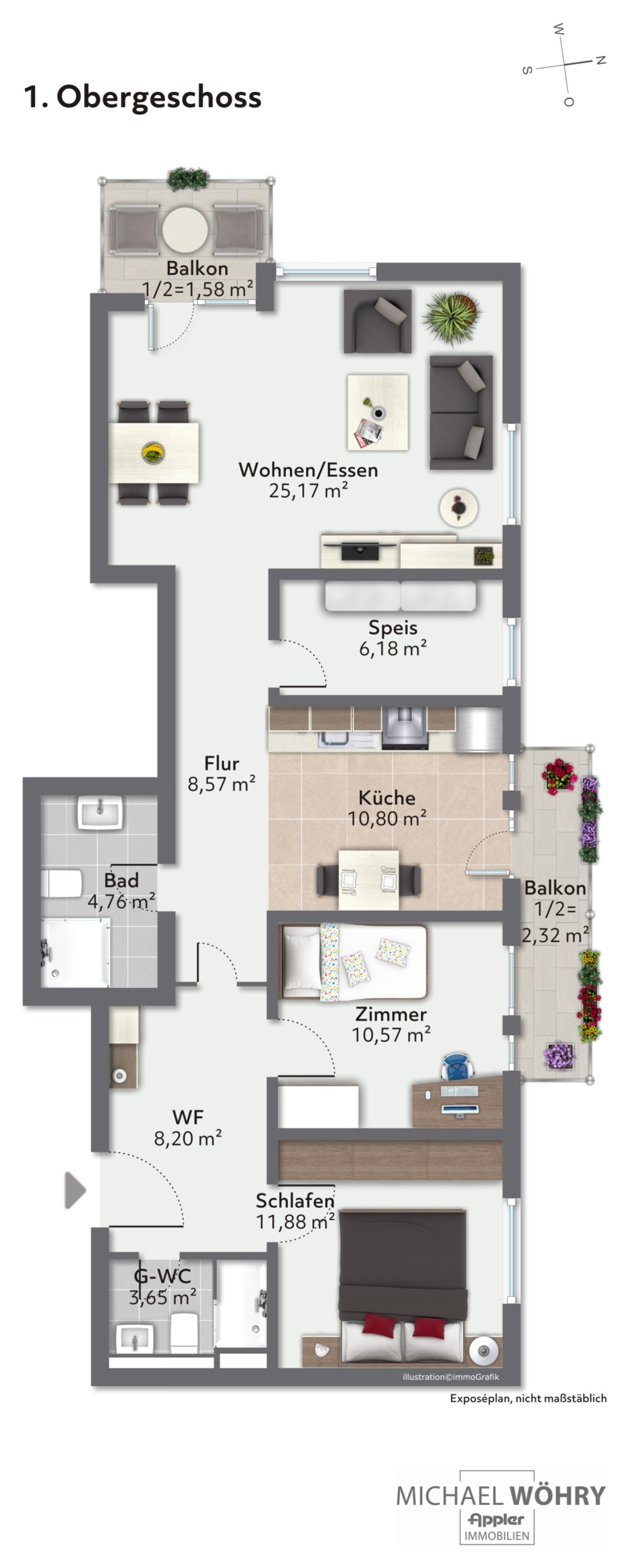 Die im Jahr 1995 erbaute Wohnung besticht durch ihren durchdachten Grundriss und ein helles, einladendes Raumgefühl. Die Wohnfläche verteilt sich auf vier Zimmer und bietet damit ausreichend Platz für individuelle Wohnkonzepte. Der großzügige Wohn- und Essbereich bildet das Herzstück der Wohnung und öffnet sich zu einem der beiden Balkone – ein idealer Ort, um sonnige Stunden zu genießen. Neben den Wohn- und Schlafräumen stehen Ihnen ein modernes Badezimmer, ein Gäste-WC sowie eine praktische Abstellkammer zur Verfügung. Große Fensterflächen sorgen für reichlich Tageslicht und eine freundliche Atmosphäre in allen Räumen.