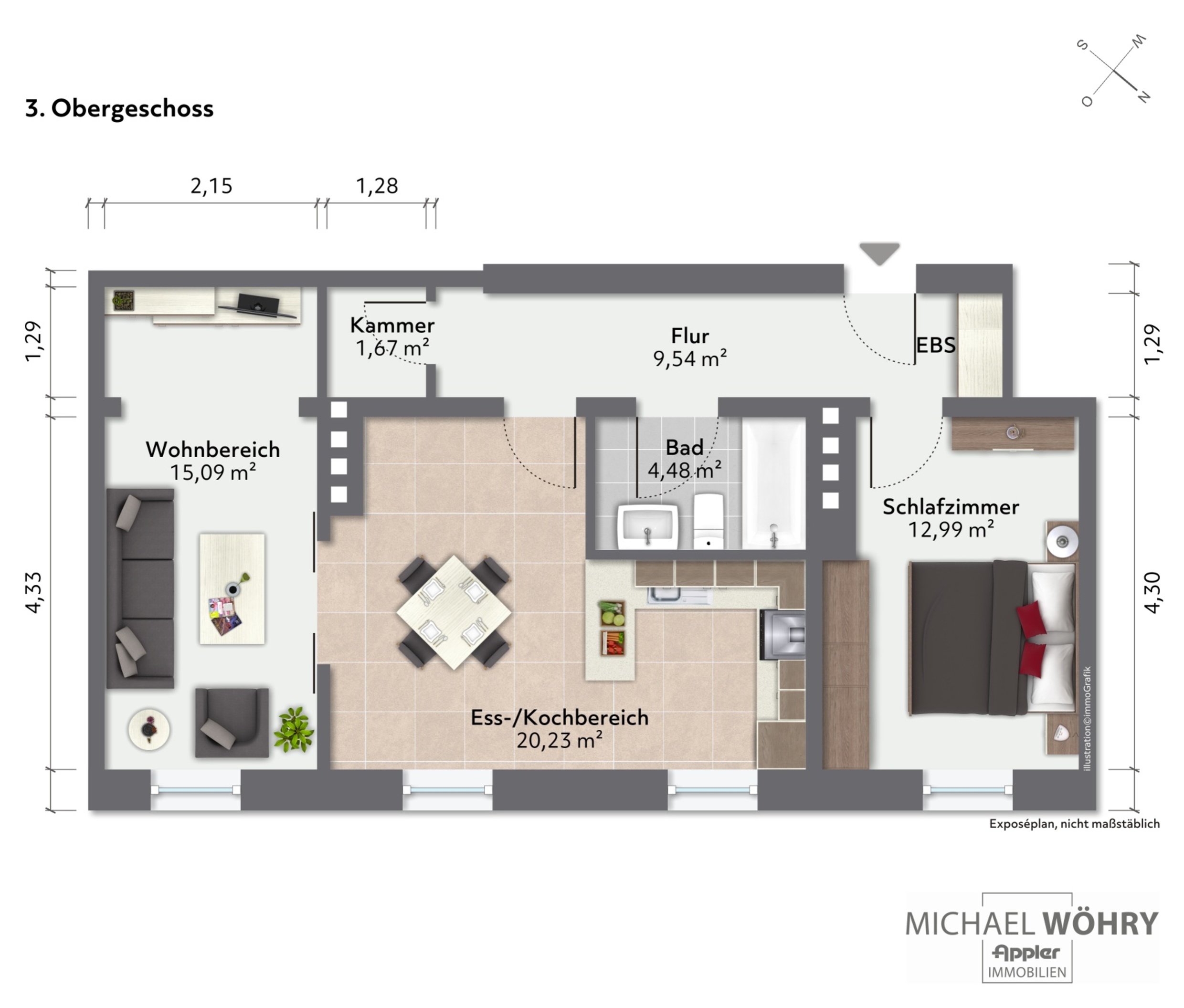 Mit dem Lift erreicht man das 3. Obergeschoss, in dem sich die Wohnung befindet. Das Raumangebot erstreckt sich über 64 m² und umfasst neben einem großzügigen Eingangsbereich, ein schönes Wohn-/ Esszimmer, ein Schlafzimmer, eine Küche und ein Bad. Die äußerst hochwertige Ausstattung bietet Ihnen ein angenehmes Wohnen mit einer hohen Lebensqualität.
