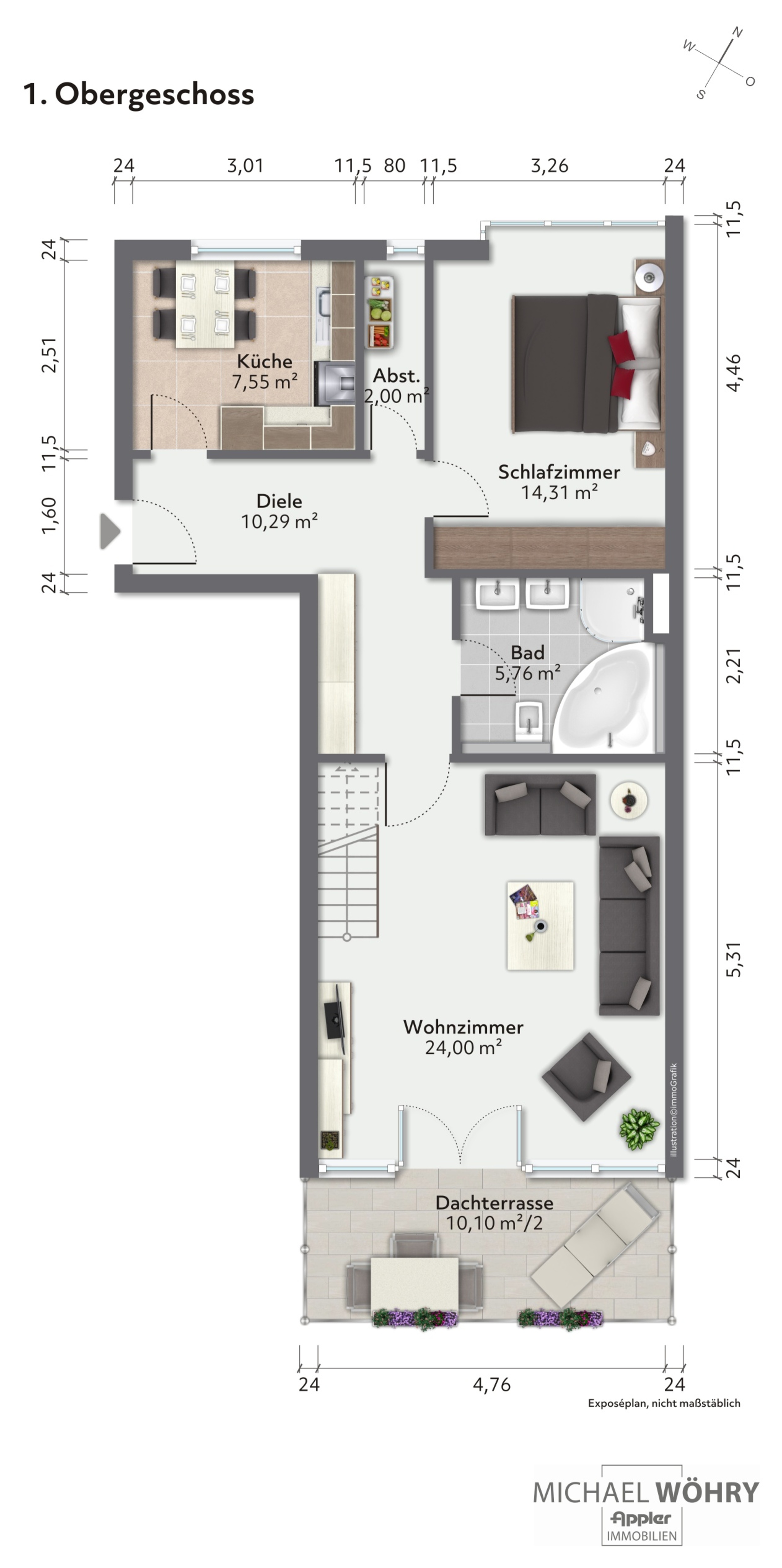 Die vorhandene Einbauküche wird vom Vermieter zur Verfügung gestellt. Ein weiters Highlight ist die große Galerie. Hier finden Sie zusätzlichen Raum, den Sie als Büro, Arbeitsplatz oder anderweiter nützen können. Eine Raumhöhe von mehr als 4 Metern höhe schafft ein großzügiges Ambiente. Ein Abstellraum ergänzt das Raumangebot.