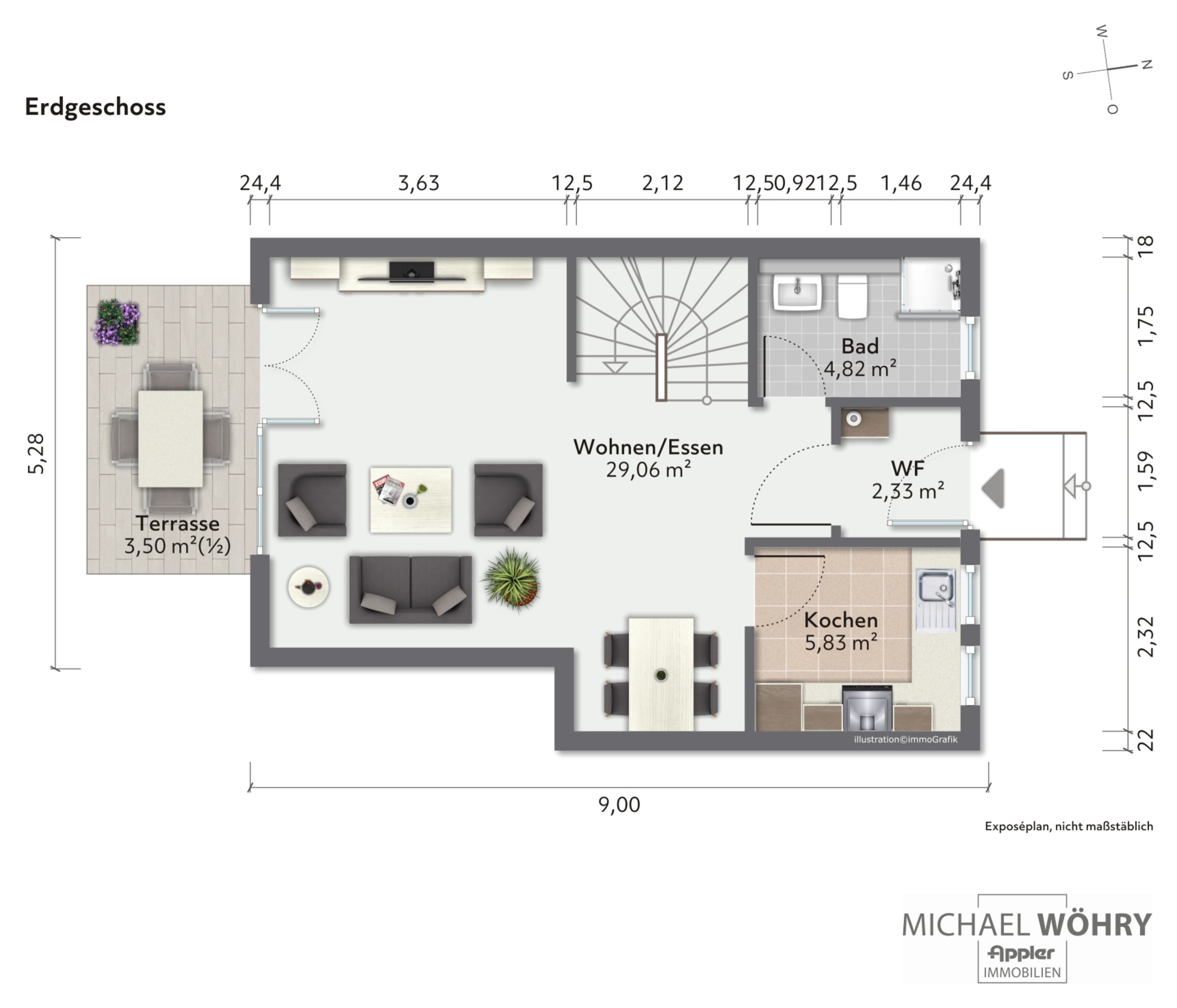 Im Erdgeschoss erwartet Sie ein großzügiger, heller Wohnbereich mit direktem Zugang zur Terrasse und dem kleinen Garten. Die Küche ist praktisch über eine Durchreiche mit dem Wohnraum verbunden. Die Wand kann jedoch ohne größeren Aufwand geöffnet werden, um einen noch großzügigeren, offeneren Wohn-/ Essbereich zu schaffen. Ein Badezimmer mit Dusche, WC, Fenster und Waschbecken sowie ein funktionaler Flurbereich komplettieren diese Ebene.
