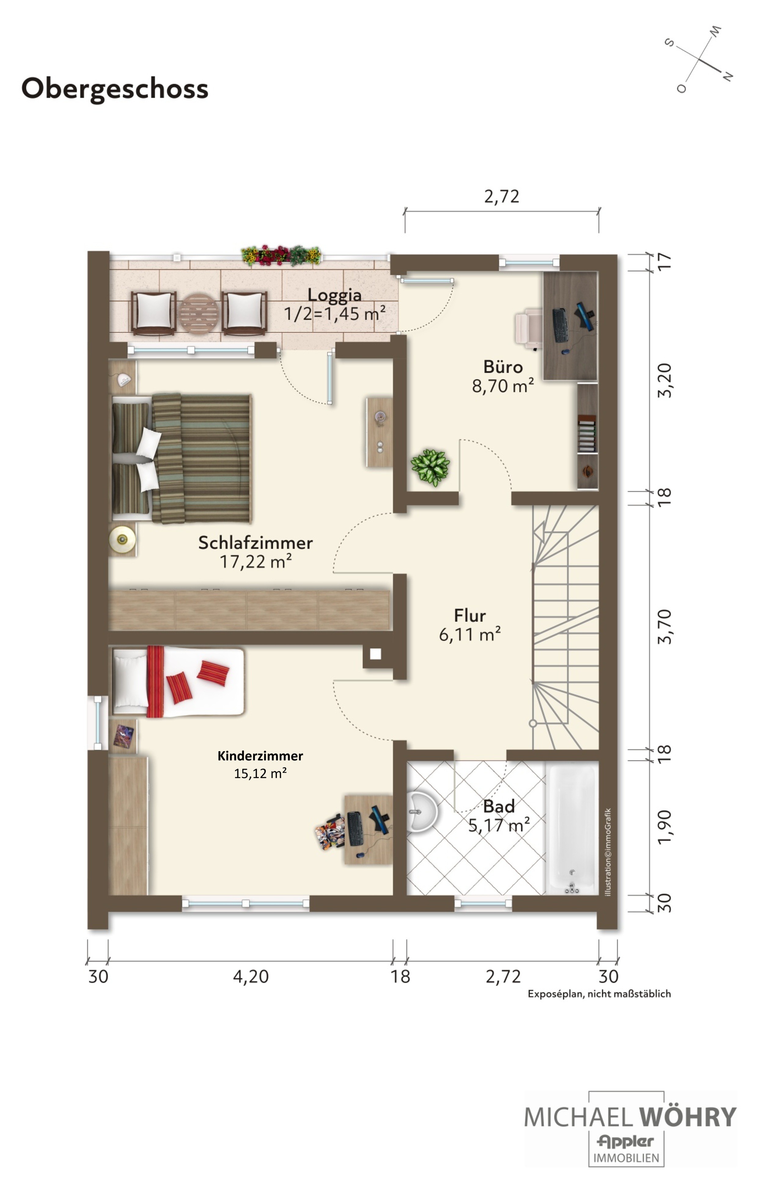 Über eine Holztreppe erreichen Sie das Obergeschoss. Hier befinden sich insgesamt drei Schlafzimmer mit Parkettboden. Zwei Zimmer haben einen Zugang auf den überdachten Südwest Loggia. Das Badezimmer ist mit einer Badewanne, zwei Waschbecken und WC ausgestattet.