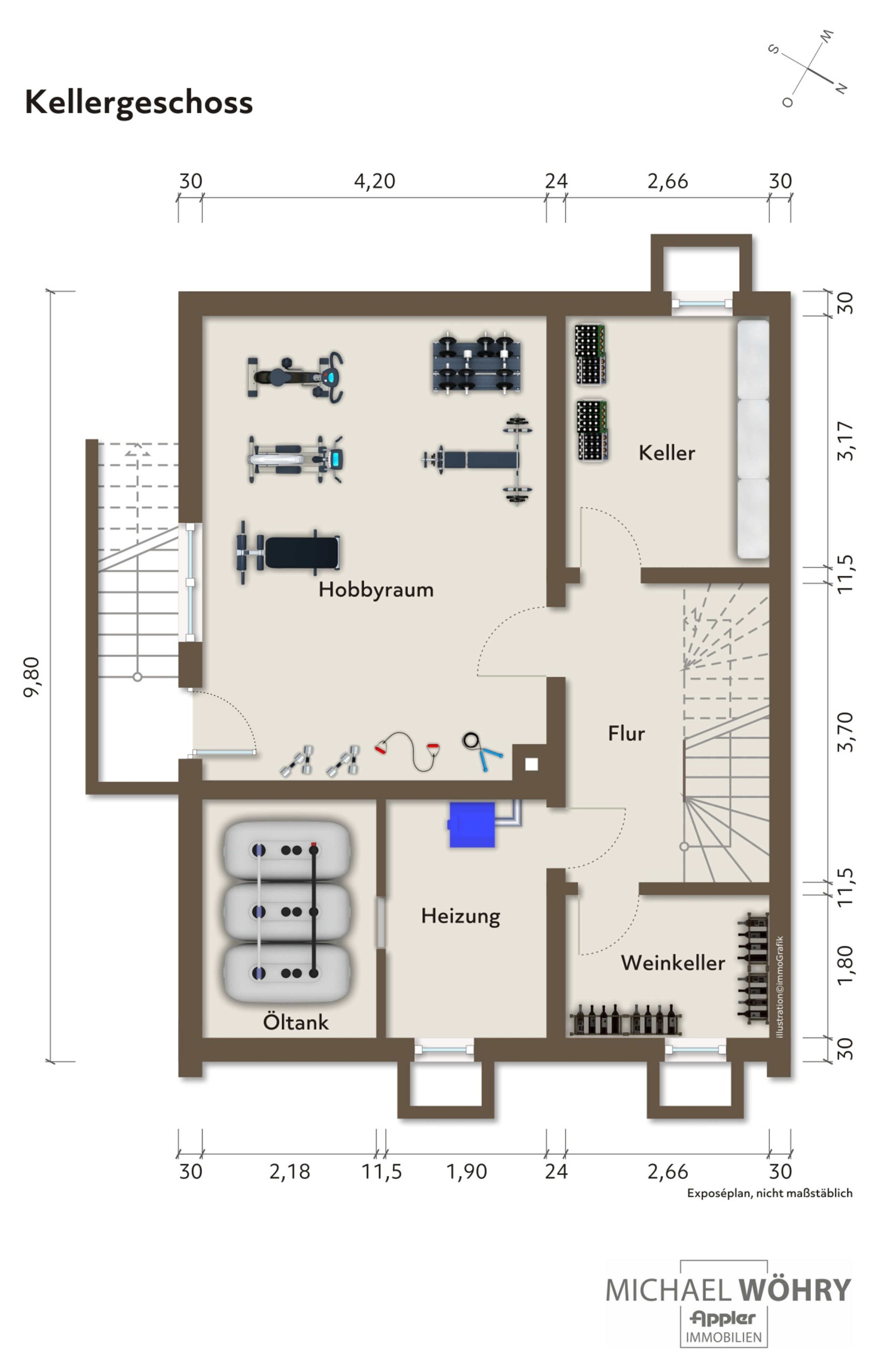 Viel Nutzfläche liefert der Kellerbereich. Der ca. 25 m² große Hobbyraum wurde mit einem PVC Bodenbelag ausgelegt. Im Technik-/ Heizraum ist die Ölheizung untergebracht. Zudem bietet der Tankraum mit seinen Tanks ca. 5.000 Liter Fassungsvermögen. Weitere Lagerflächen sind in zwei weitern Kellerräumen vorhanden. Als sehr praktisch erweist sich die Außentreppe zum Gartenbereich.