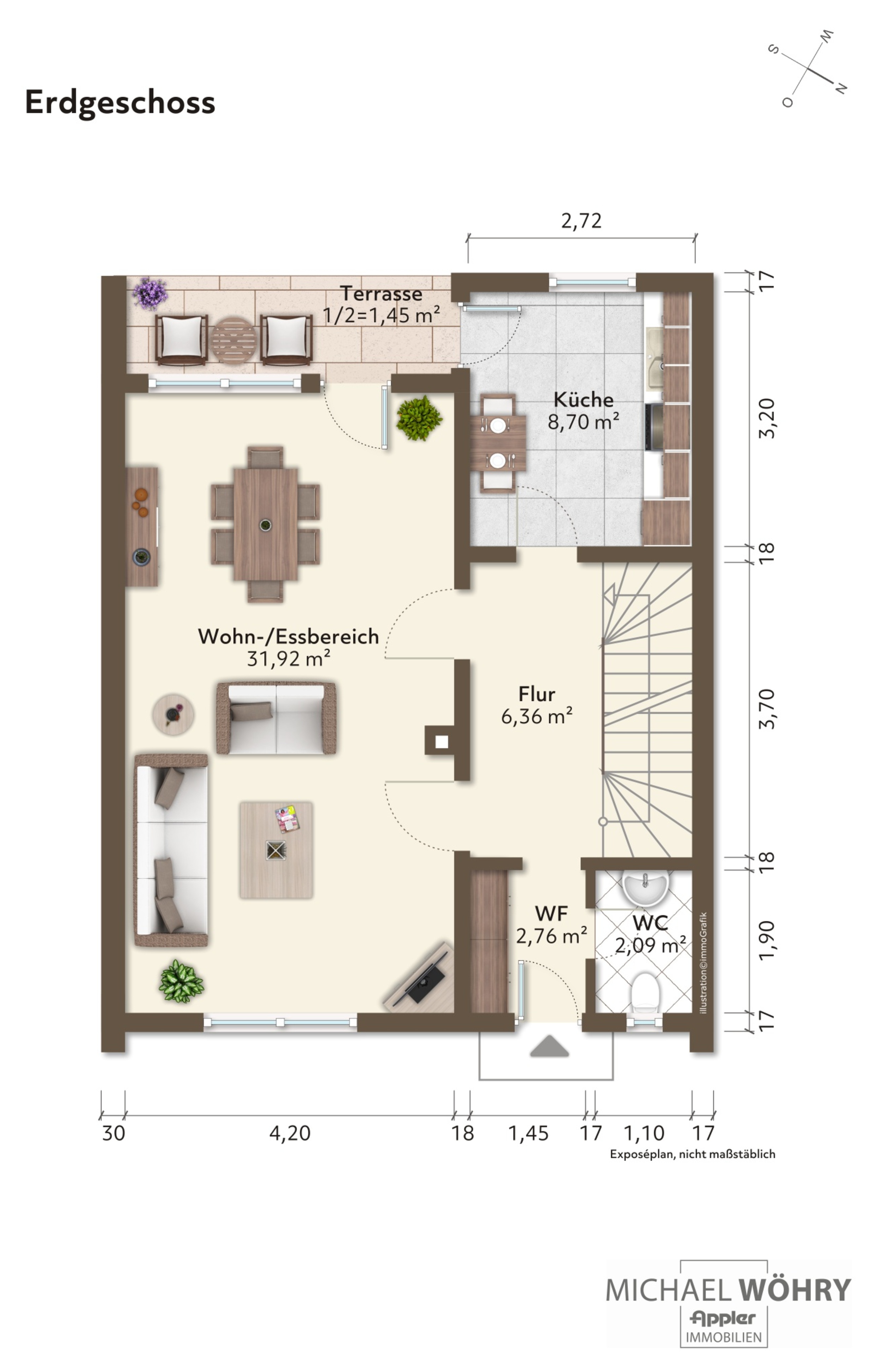 (ca. 31 m²). Vom Wohnbereich gelangen Sie auch auf auf die sonnige Terrasse samt Südwestgarten. Eine Hecke sorgt für einen nahezu uneinsehbaren Garten