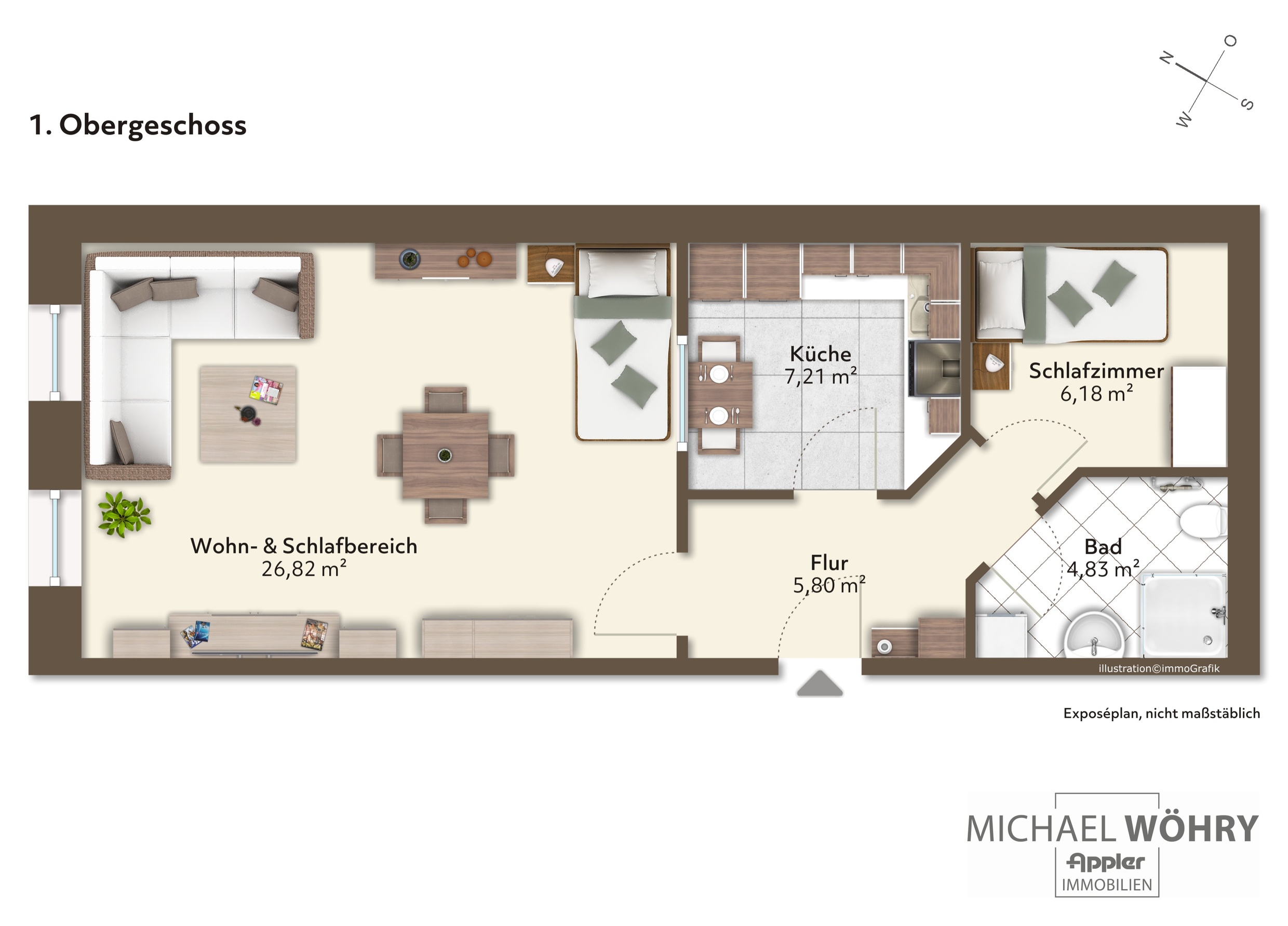 Diese helle 1,5-Zimmer-Wohnung befindet sich im 1. Obergeschoss in einem gepflegten Mehrfamilienhaus und bietet angenehmes Wohnen in schöner Lage.