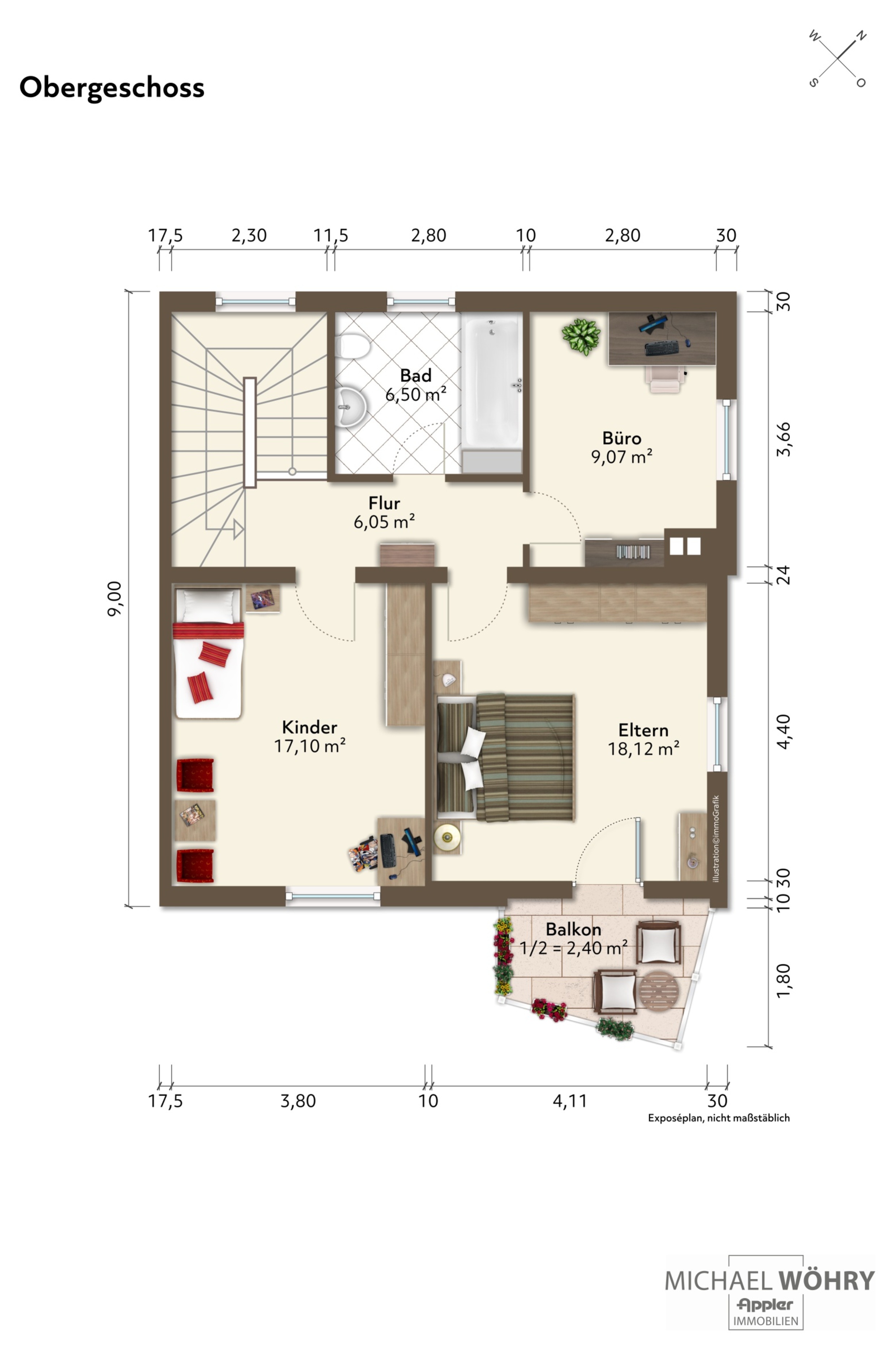 Im Obergeschoss befinden sich drei gut geschnittene Schlafzimmer – Eines davon mit Zugang zu einem Südbalkon. Das kleine Tageslichtbad ist ausgestattet mit Badewanne, WC und Waschbecken. Im Flurbereich befindet sich eine Zugtreppe um in den Speicher zu gelangen.
