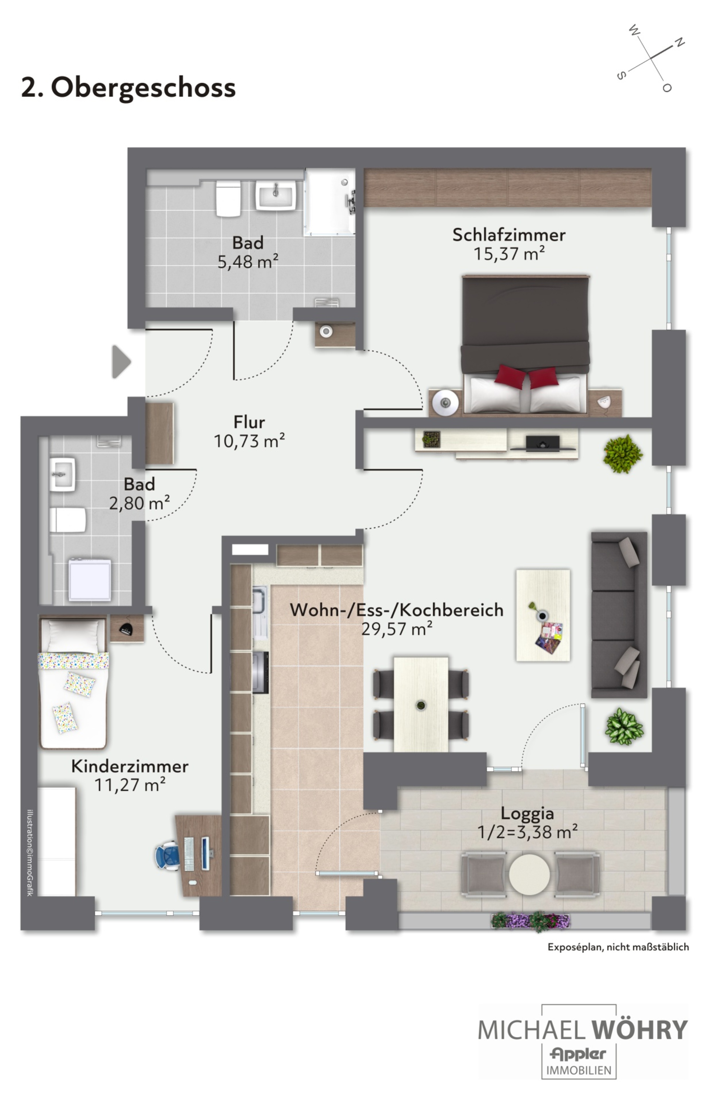 Über einen Lift gelangen Sie barrierefrei in das zweite Obergeschoss. Nach Betreten der Wohnung befinden Sie sich im Flurbereich welcher sämtliche Räume auf dieser Ebene miteinander verbindet. Der großzügige Wohn-/ Kochbereich umfasst knapp 30 m² und ist mit einer modernen, hochwertigen Einbauküche samt Steinarbeitsplatte und überwiegend "Miele"-Elektrogeräten ausgestattet, welche bereits im Kaufpreis enthalten ist.