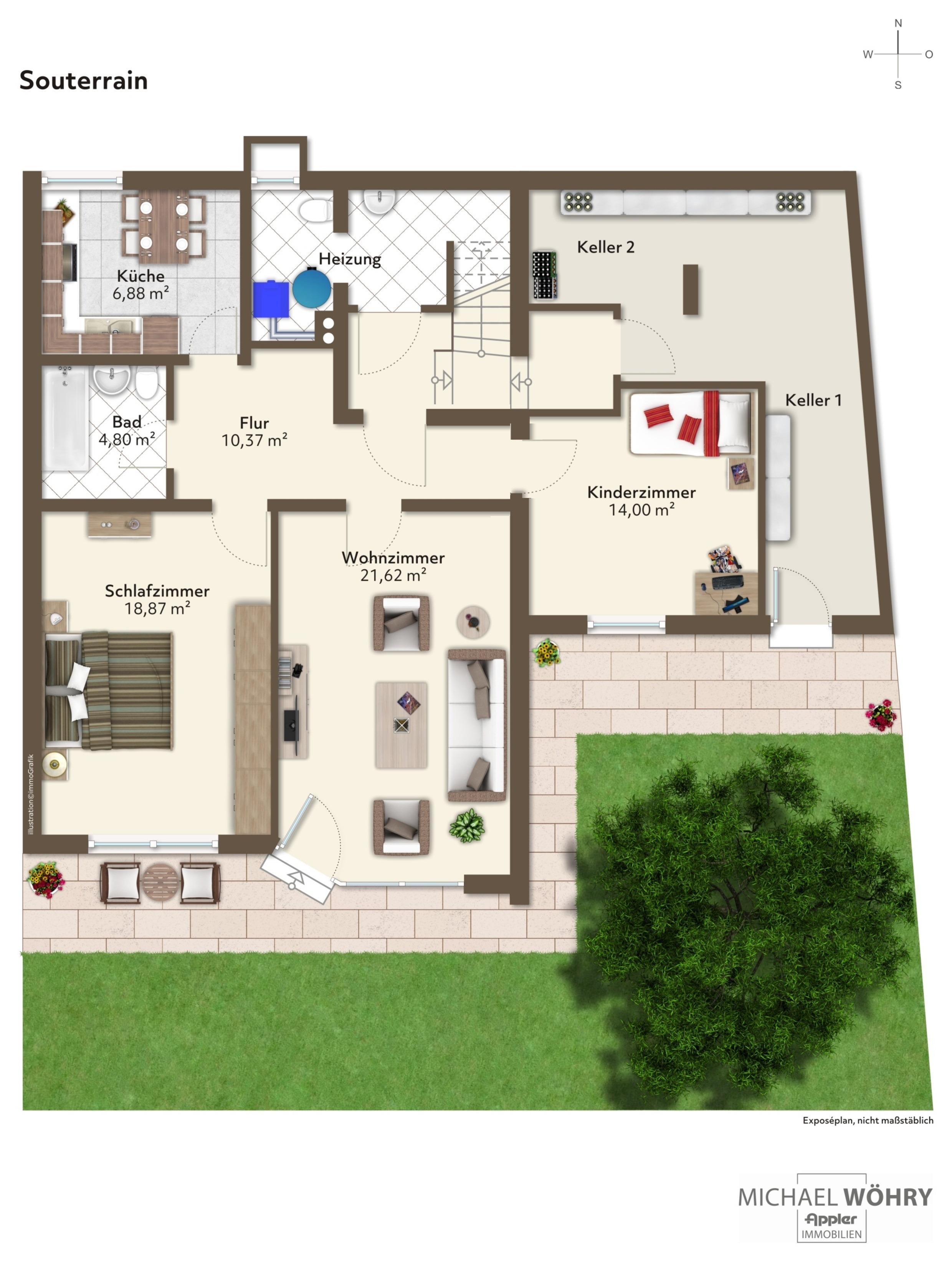 Das Souterrain, welches einen direkten Zugang zum ruhigen Garten ermöglicht, umfasst knapp 76 m² und verfügt über drei weitere Zimmer, eine Küche sowie ein Bad. Dank der guten Belichtung und der separaten Erschließung kann dieser Bereich als eigenständige Wohneinheit genutzt werden – perfekt für ältere Kinder, Gäste oder zur Vermietung. Alternativ lässt sich das gesamte Haus auch zu einer großzügigen Doppelhaushälfte zusammenführen und individuell gestalten.